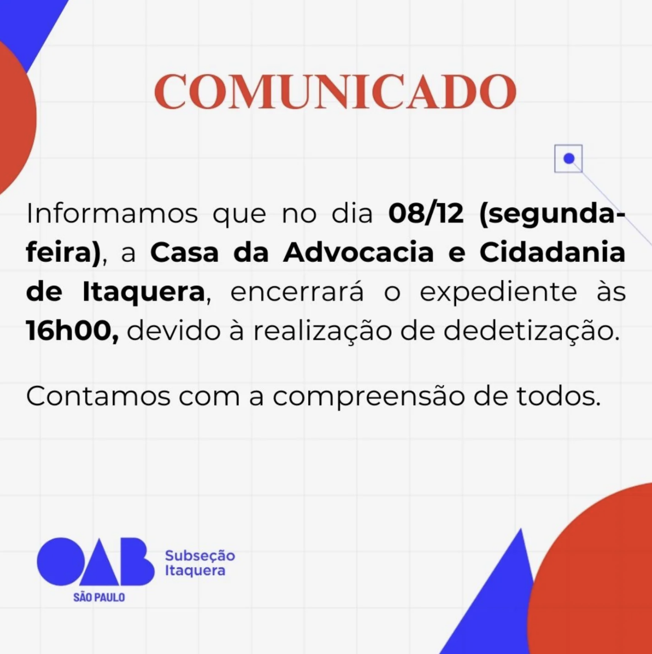 Informamos que no dia 08/12 (segunda-feira), a Casa da Advocacia e Cidadania de Itaquera, encerrará o expediente às 16h00, devido à realização de dedetização.